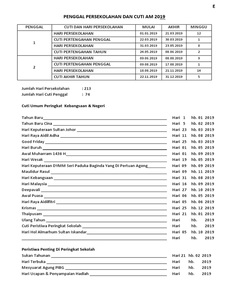 Berikut dikongsikan takwim penggal persekolahan tahun semasa yang telah disediakan oleh kpm takwim yang disediakan oleh kpm memperincikan tentang tarikh mula dan tamat penggal persekolahan serta tarikh cuti persekolahan. Pindaan dibahagikan kepada dua iaitu sekolah kumpulan a iaitu johor, kedah, kelantan dan terengganu manakala kumpulan b membabitkan melaka, negeri sembilan, pahang. Berikut kami kongsikan takwim jadual penggal persekolahan dan cuti sekolah tahun 2019 mengikut kumpulan. Berikut adalah takwim cuti persekolahan dan juga cuti perayaan untuk tahun 2019 yang telah diumumkan oleh kementerian pendidikan malaysia. Berikut adalah jadual cuti perayaan melibatkan tahun baru cina, hari raya aidilfitri dan deepavali bagi sesi persekolahan tahun 2019.