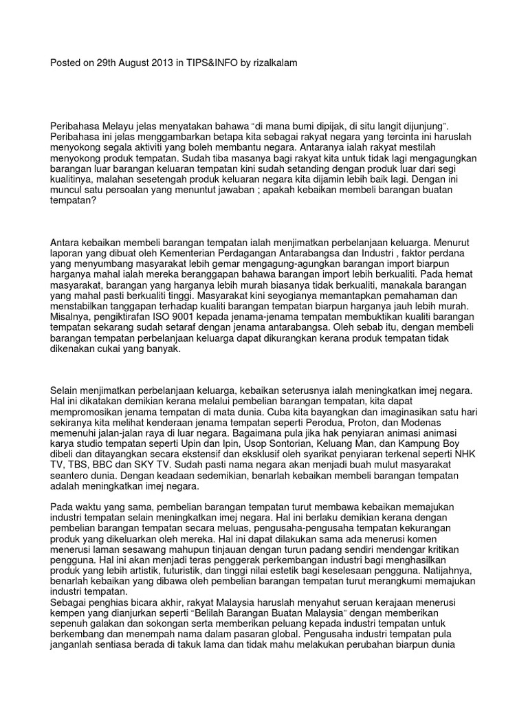 Contoh Karangan Astro from reader020.staticloud.net Langkah pertama dalam memberi galakan pembelian barangan buatan malaysia adalah dengan sentiasa mengutamakan produk tempatan apabila membeli belah. Hal ini kerana kita akan menerima pelbagai kebaikan dan faedah bagai sambil menyelam minum air sekiranya kita membeli barangan buatan malaysia. Barang buatan malaysia ialah barang yang dihasilkan di dalam negara. Tapi tahap komitmen rakyat untuk membeli barangan buatan malaysia (sebanyak) 41 peratus sahaja. Kemajuan setelah dasar sains dan teknologi dijalankan dasar belilah barangan buatan malaysia objektif menggalakkan penggunaan sains dan teknologi sebagai alat untuk pembangunan ekonomi , untuk membaiki kedudukan fizikal serta kesejahteraan rakyat , dan untuk melindungi kedaulatan. Rakyat malaysia perlulah menyokong kempen belilah barangan buatan malaysia demi kebaikan rakyat dan negara. Rakyat malaysia perlulah menyokong kempen belilah barangan buatan malaysia demi kebaikan rakyat dan negara. Kempen beli barangan malaysia merupakan susulan daripada kempen beli barangan buatan malaysia yang telah dilancarkan pada tahun 1998.